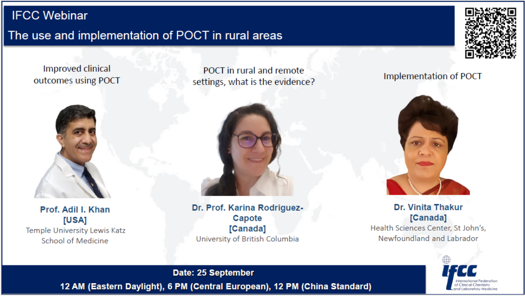 Esta sesión explorará la implementación y el impacto de las pruebas en el punto de atención (POCT) en entornos sanitarios remotos y rurales. La Dra. Rodríguez-Capote presentará el concepto de POCT, destacando su papel en el análisis de muestras de pacientes fuera de los laboratorios tradicionales, a menudo realizado por personal clínico sin formación en laboratorio. Analizará las implicaciones económicas y la importancia de demostrar una ventaja clínicamente significativa en la toma de decisiones, en comparación con las pruebas en laboratorios centrales. Se aplicarán los principios de la medicina de laboratorio basada en la evidencia para evaluar los beneficios, las limitaciones y los desafíos de las POCT en zonas rurales. La Dra. Thakur presentará la experiencia de Terranova y Labrador, donde las duras condiciones climáticas y el envejecimiento de la población exigieron la creación de una división provincial de POCT. Esta presentación describirá la gestión integral de las POCT, incluyendo el desarrollo de procedimientos, la acreditación, la formación, el control de calidad y la gestión de la utilización. Ejemplos de gestión de enfermedades agudas y pruebas de cribado de enfermedades infecciosas ilustrarán cómo un marco estandarizado de POCT puede mejorar la eficiencia operativa y los resultados sanitarios. Finalmente, la Prof. Khan analizará el potencial de las POCT para reducir las disparidades en la atención sanitaria en regiones rurales y desatendidas. Su presentación enfatizará la importancia de integrar POCT en vías clínicas bien definidas para lograr mejoras significativas en la atención al paciente, respaldado por un estudio de caso que demuestra mejores resultados luego de la implementación de POCT en un entorno rural.