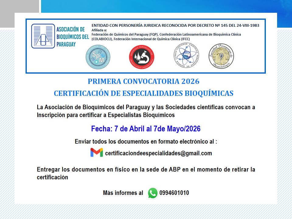 La Asociación de Bioquímicos del Paraguay y las Sociedades Científicas comunican la Primera Convocatoria 2025, de la Inscripción para certificar a Especialistas Bioquímicos.