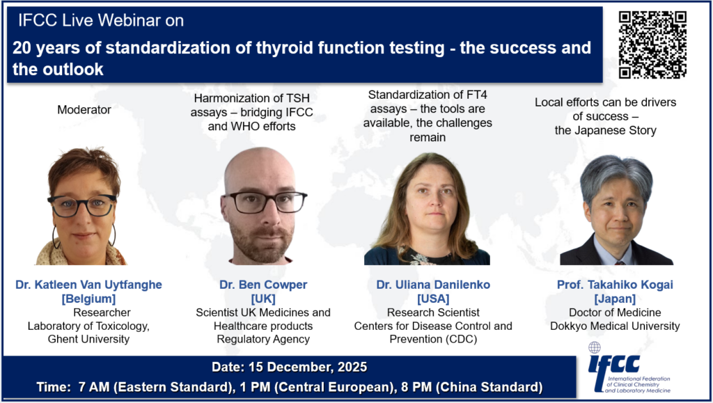 Las mediciones de la hormona estimulante de la tiroides (TSH) y la tiroxina libre (T4L) son fundamentales para la detección temprana de enfermedades tiroideas y el seguimiento del tratamiento. El Comité de la IFCC para la Estandarización de las Pruebas de Función Tiroidea (C-STFT) estableció en las últimas dos décadas sistemas de referencia para la armonización de la TSH y la T4L, y actualmente colabora con socios nacionales en su implementación. Estas actividades de implementación incluyen el mantenimiento de los sistemas de referencia, su uso para estandarizar y armonizar ensayos, y actividades educativas para informar a las partes interesadas sobre los cambios previstos en los valores de medición como resultado de la estandarización y la armonización. En las dos primeras presentaciones, presentaremos brevemente los sistemas de medición de referencia desarrollados para la TSH y la T4L y nos centraremos en los últimos avances en su implementación. Para la TSH, se analizará con más detalle la importancia del uso de los paneles de armonización de TSH del C-STFT, en paralelo con el uso del 4.º Estándar Internacional de la OMS para TSH. En la segunda presentación, nos centraremos en la aplicación e implementación de la red de laboratorios de referencia de T4L. En la presentación final, nos centraremos en el camino hacia la implementación exitosa de la armonización de TSH en Japón, que fue posible gracias al apoyo de las sociedades académicas y la división pertinente del Ministerio de Salud, Trabajo y Bienestar de Japón.